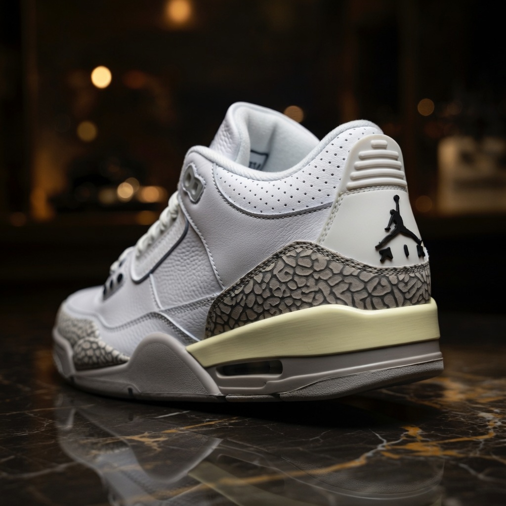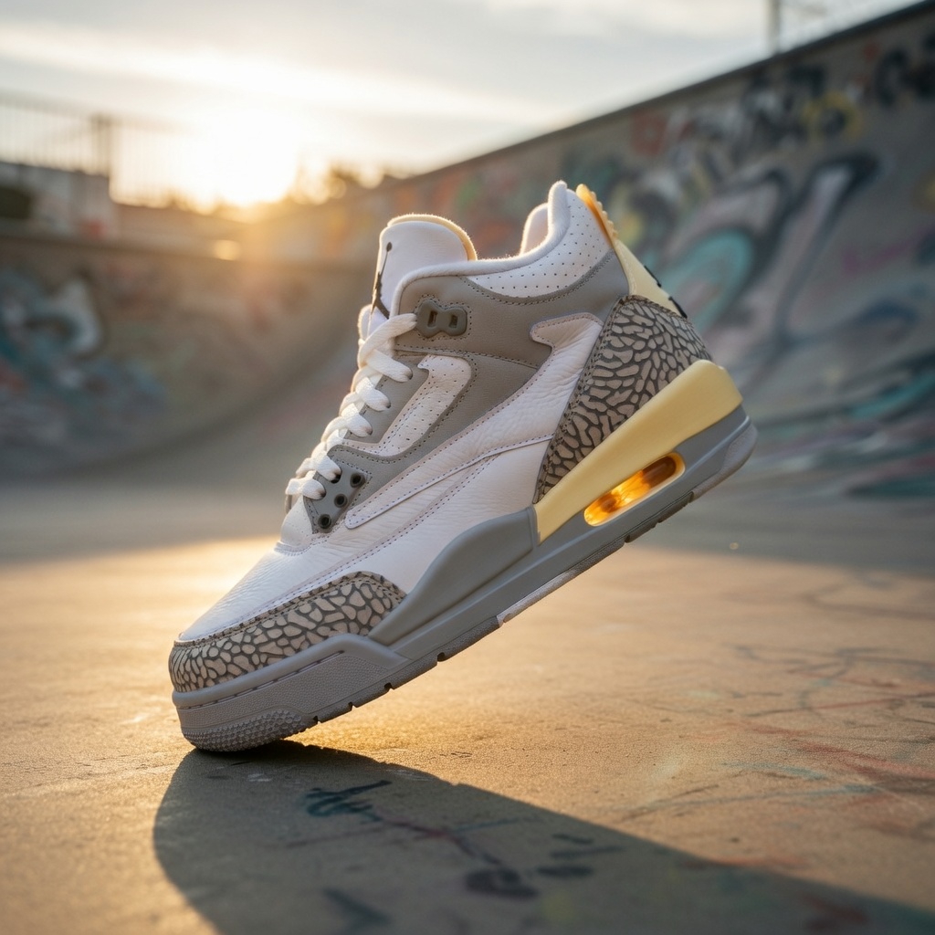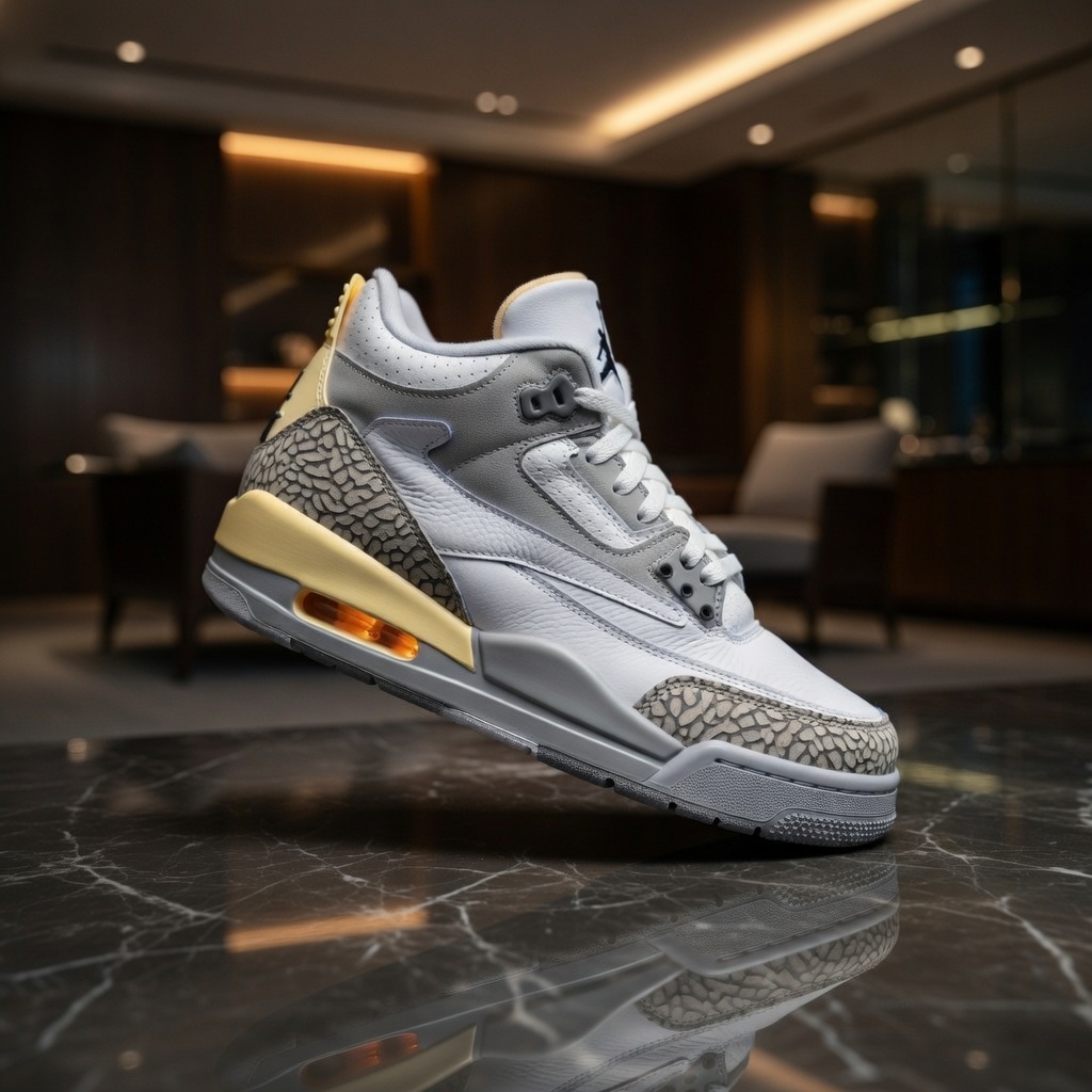 These are super premium and understated: smooth ivory/cream leather upper for that fresh, versatile base, with textured Grey Mist suede overlays adding serious depth and luxury feel—especially on the iconic elephant print panels at the forefoot and heel. Gold-tinted accents pop on the Jumpman logo, eyelets, and that translucent Air-Sole unit in the heel (giving off warm, subtle glow vibes), plus crisp white laces, perforated toe box for breathability, and a matching grey midsole/outsole combo that keeps it grounded and comfy all day. It’s got that elevated “Craft” edition quality—clean, classy, and perfect for everyday flex or dressing up your fits ✨👟
