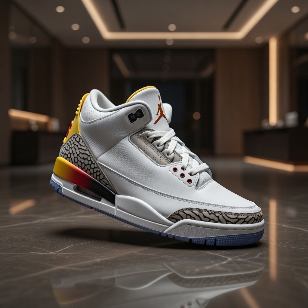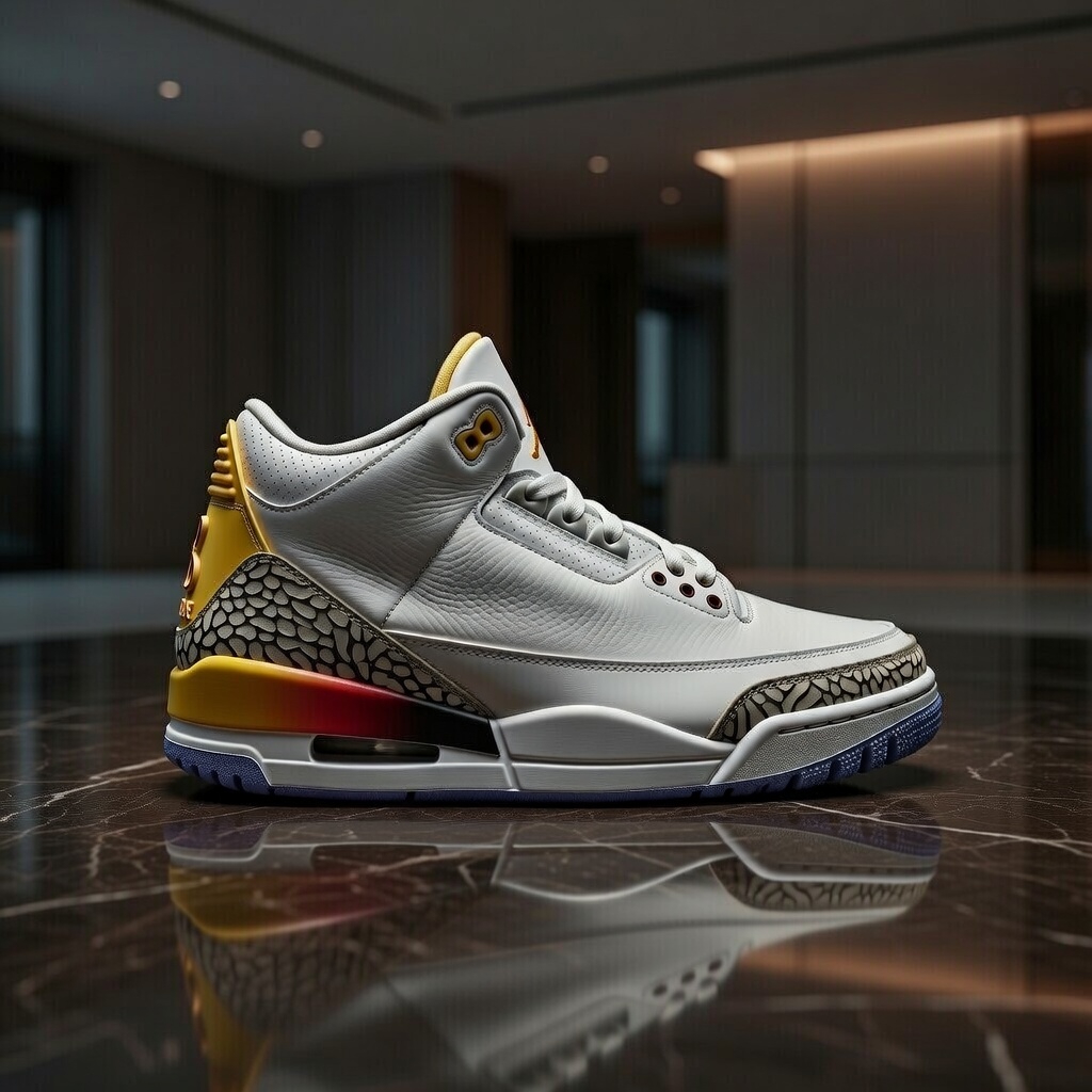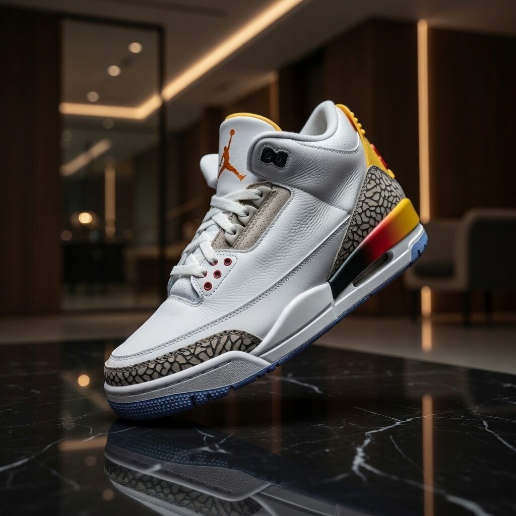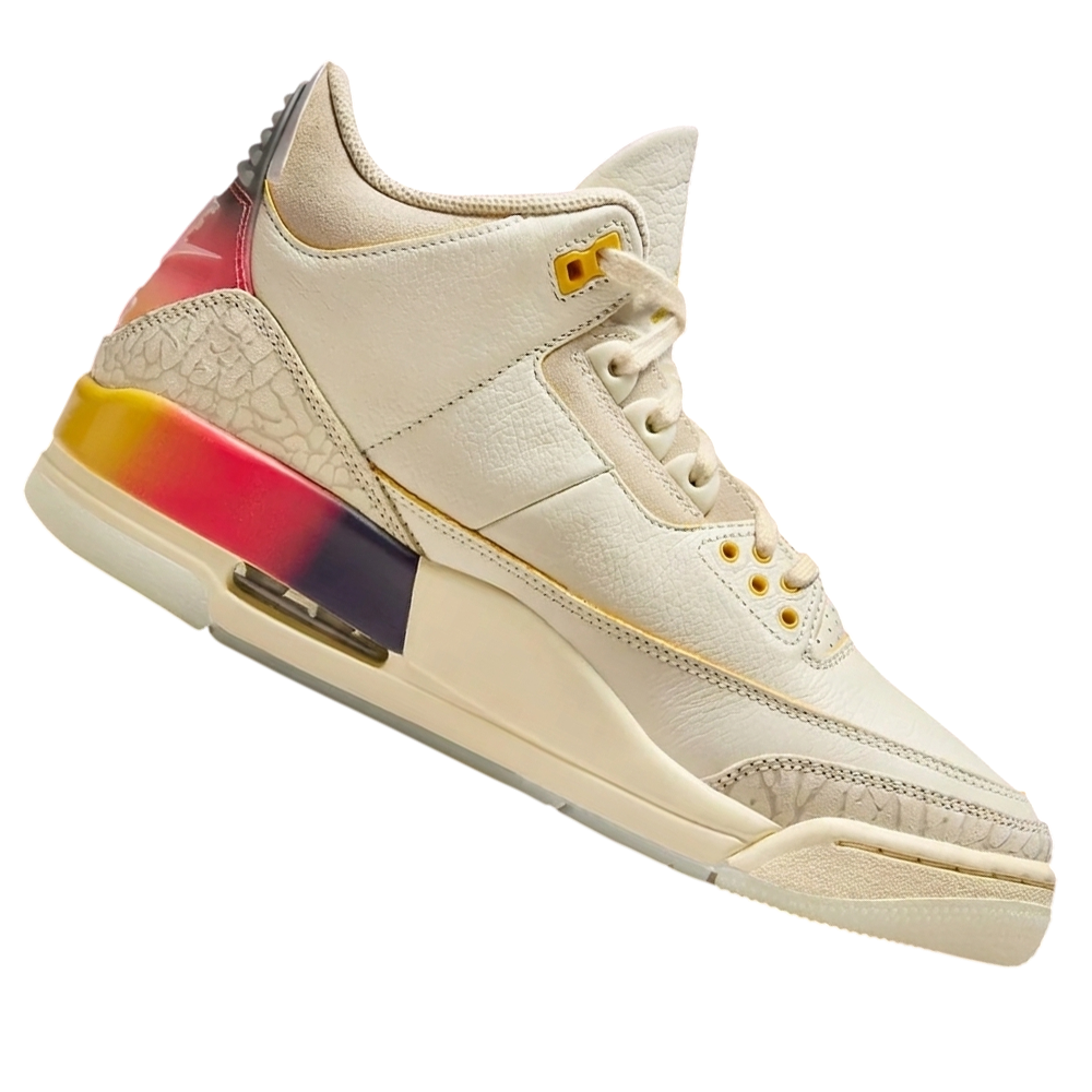 This collab is pure vibes: inspired by the breathtaking sunsets of J Balvin’s hometown Medellín, Colombia. It starts with a creamy Coconut Milk (off-white/ivory) leather upper that’s super clean and premium, layered with iconic elephant print overlays in tonal shades. The real magic is in those gradient accents fading from fiery crimson/red through orange to yellow/solar flare on the heel and midsole, evoking that perfect sunset sky. Subtle gold hits on the eyelets and Jumpman branding add a luxurious touch, with Nike Air cushioning for all-day comfort and that classic AJ3 silhouette everyone loves. It’s vibrant yet wearable, a true statement piece that blends street cred with artistic energy ✨🌅